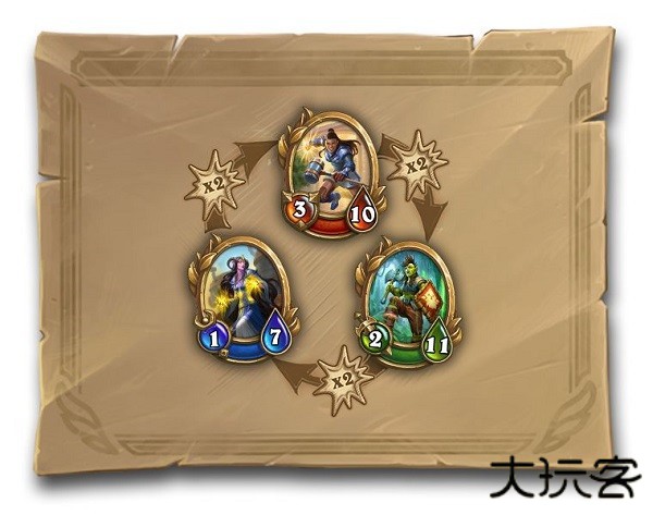 在这个模式里,不同职业间是存在双倍伤害的克制关系的,红色护卫克制绿色斗士,绿色斗士克制蓝色施法者,蓝色施法者克制红色护卫,这种克制存在于所有的技能当中,即不管绿色施法者是用物理技能还是法术技能,都可以对红色护卫造成双倍伤害。