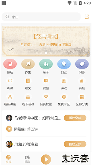 象曰是一款国学经典学习平台。近年来,国家对中华传统文化越来越重视,许多人也想了解更多的传统文化,这款软件就涵盖了非常丰富的国学知识,可以让大家利用碎片化时间学习。软件中内容涵盖多个方面,用户可以通过听课、看文、视频、讲座等方式了解,并且所有内容通俗易懂,即使是小朋友也可以轻松掌握。