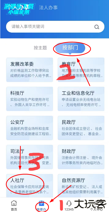 在我要办板块,选择按部门,找到人社厅;