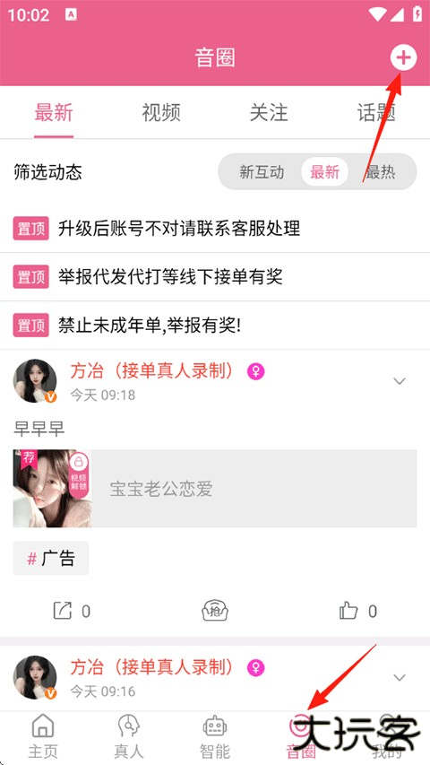 1、打开萌配音APP,首页点击音圈-右上角+图标;