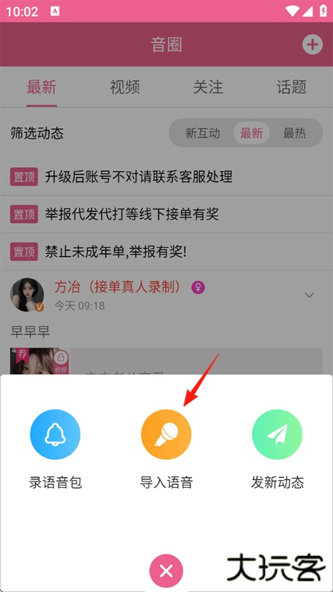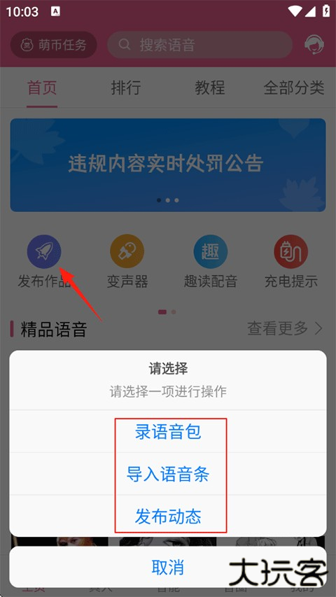 3、或者在首页点击发布作品,在弹出的列表中选择导入语音条。