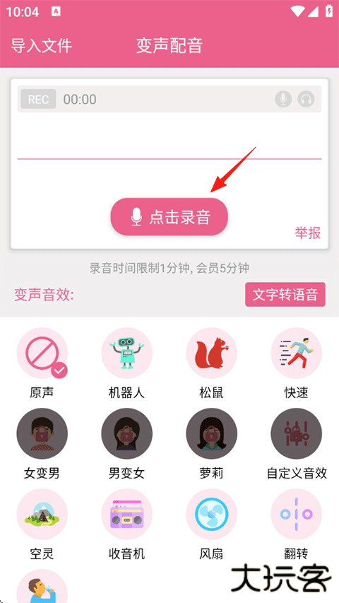 2、点击录音或者右上角导入文件,然后在下方选择变声音效,完成后确认无误即可发布作品到平台;