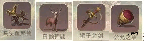 T3级别:马头鱼尾兽、白额神鹿、狮子之剑、公允之章(简称马头、白鹿、宝剑、公章)
