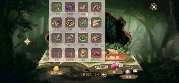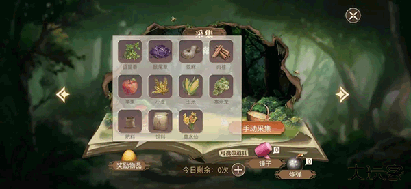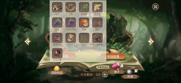 游戏中有些材料,是无法通过种植养殖获取的,只能够用另一个地图中的“采集、打猎、挖矿(未开通)”获取,比如:百里香、白玉涅、榆木、豆蔻、薄荷等等,这些材料是主线任务必备的,更是星座任务和传记任务必备的(星座和传记我后面会讲),而采集、打猎、挖矿的次数每天只有三次,即使钻石购买次数,也只可以额外购买三次,也就是我开头说的3+3。
