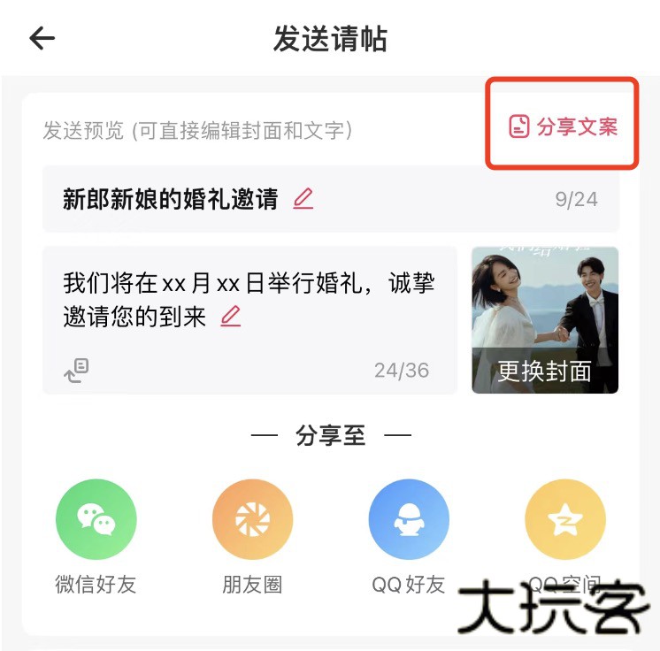 2、编辑好请帖的标题和文案,点击分享至微信好友。右上角的“分享文案”有整理好的公布结婚喜讯的流行文案,点一点就能替换,非常方便哦。