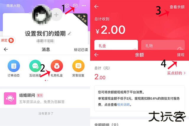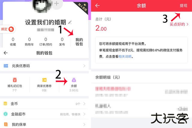 Step1:一共有3个方式可以进入到余额提现的界面,第一个方法是打开婚礼纪个人页直接点击【我的钱包】,在这里面有一个【余额】选项点击进入可以查看余额的数量,然后点击右上角的【提现】进入提现界面。