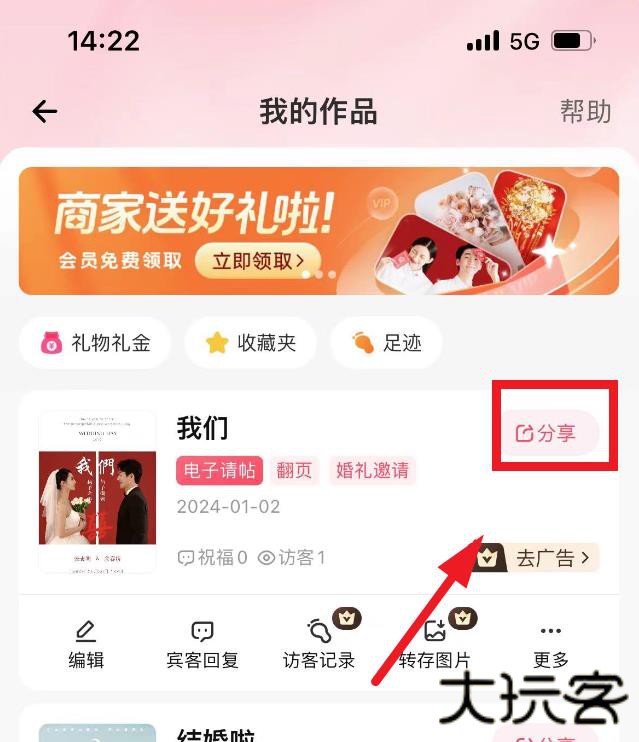 1、在【婚礼纪APP】我的请帖中找到准备分享的请帖,请帖列表中,每个请帖的右上角有“分享”按钮。