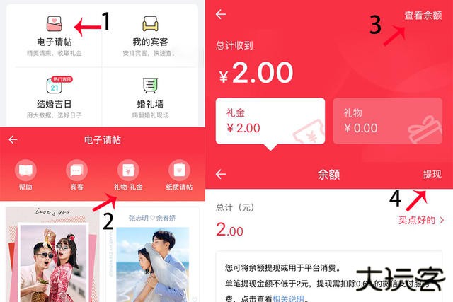 Step2:第二方法是点击【电子请帖】进入其界面并选择【礼物·礼金】选项,在这里能够查看礼金和礼物的金额数量。然后点击右上角【查看余额】可以进入余额界面,和第一种方式一样点击右上角的【提现】按钮就可以进入提现界面了。