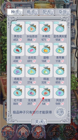 1、在游戏中首先选择【集市】,购买红玫瑰与白玫瑰的种子,要是商店中没有需要通过刷新来获得。