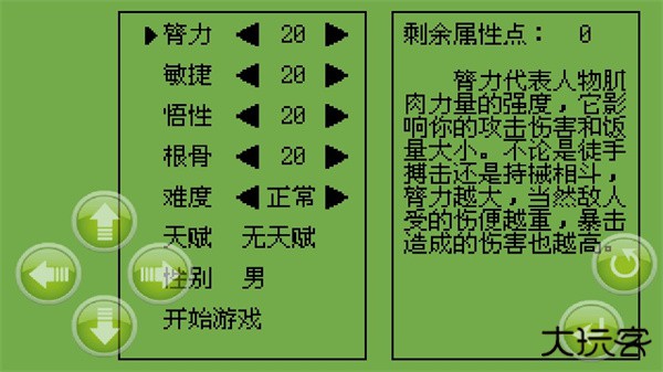 3、这里玩家可以对人物的臂力、敏捷、悟性、根骨等进行分配属性点,然后点击开始游戏;