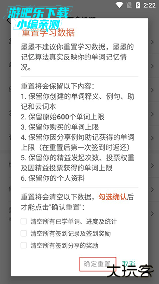 把3个选项全勾选,然后点击【确定重置】,这样就可以重新背了。