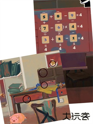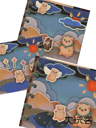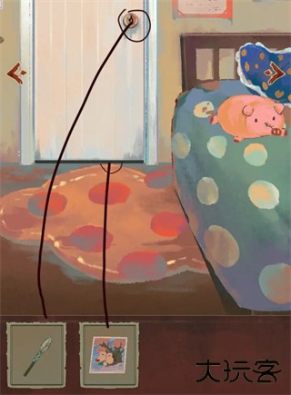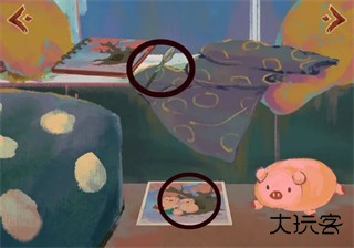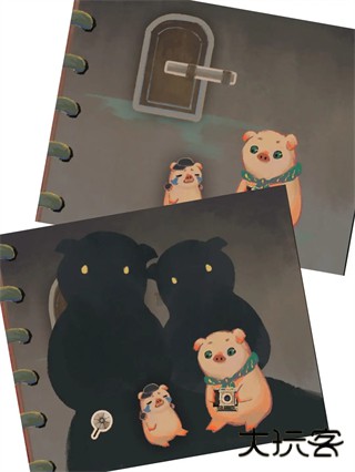 4、拉开门栓点击木门,把帽子小猪旁边的箱子点开,拿到圆盘(不知道叫啥姑且叫它圆盘)拖给相机,拍下合照