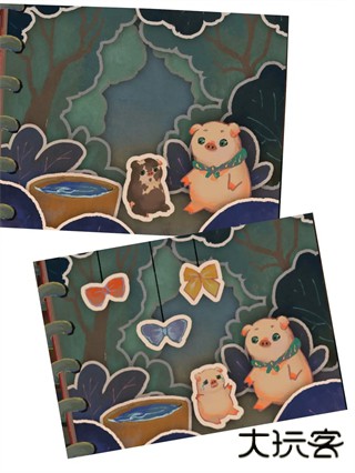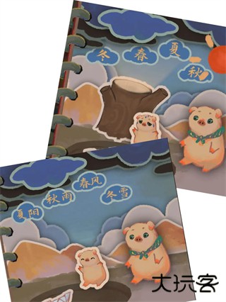 2、将春拖到木桩上长出叶子给小猪遮荫,再拖动秋雨积起水洼让小白船漂浮