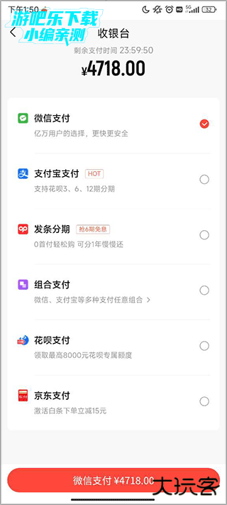 3、跳转页面后在支付方式中选择分期。
