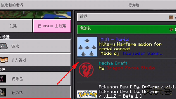 若只想在单个地图内使用,在地图的设置菜单内找到资源包选项卡,激活即可;而附加包需要把行为包和资源包都激活,并且大部分附加包都是需要开启实验玩法才可以正常使用的。