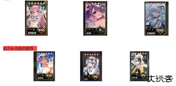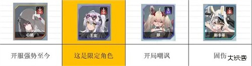 2、莉莉丝属于限定角色,如果初始号有的话可以养成(攻击队核心,要上4个攻击角色包括自己),如果没有可以选择将其换成其他攻击型角色或者坦克角色。王女与斯卡蒂应该每一个账号都能抽出来,属于平民战神类角色。