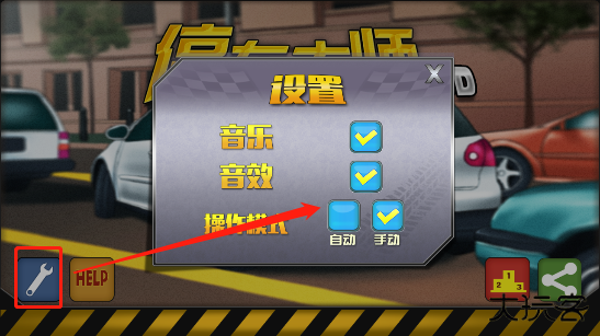 1、进入游戏点击打开设置,我们可对游戏中车辆的驾驶模式进行切换,除此之外还可以开启或关闭游戏中的音乐与音效