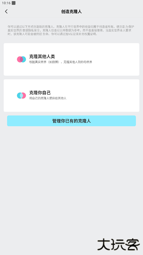 2、在“发现”页面,可以参与克隆人计划,捏造智能;