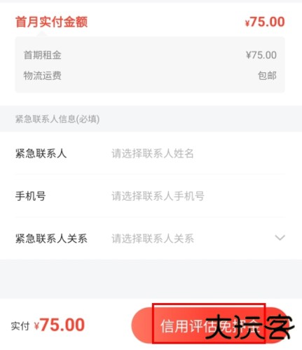 3、填写好紧急联系人信息,点击信用评估免押金按钮,就可以直接查看到了,基本芝麻分≥600都可以的。