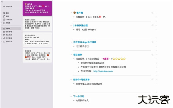 比如,需要与他人合作完成的任务,打上#待协作、#Waiting 等标签,并加上待协作的人 (@zhangsan) 和分配协作进度。
