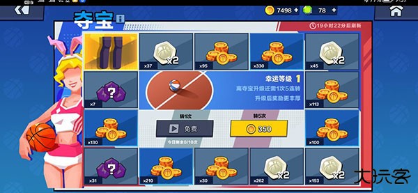 5、每日免费一次夺宝,再加上看广告10次夺宝,每日一共11次,可以随机获得翻倍奖章,熟练度,金币。(不建议用金币购买夺宝,不划算)