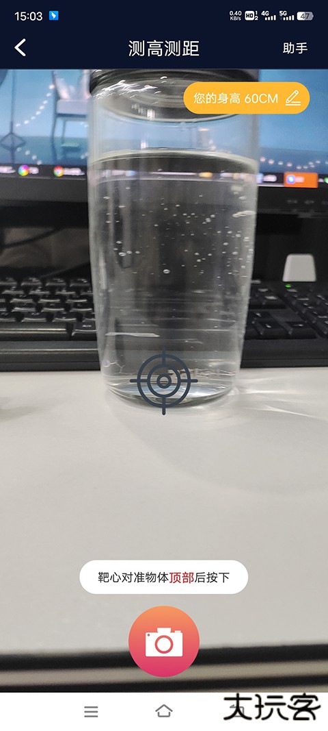 3、将镜头对准测量物体所在的最底部,缓缓移动手机,对准底部按下确定。