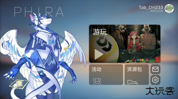 一、进入游戏主界面,你可以看到“游玩”,“资源包”,“信息”(邮件图标),账号和“设置”(齿轮图标)