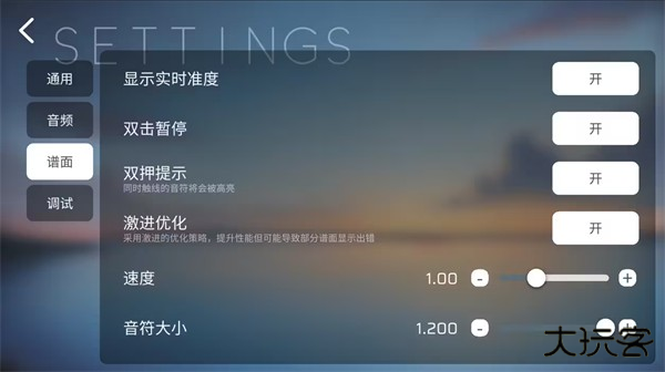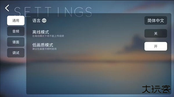 设置共分为5大类,“通用”,“音频”,“谱面”,“调试”,“关于”