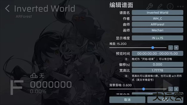 点击铅笔图标,屏幕右边出现谱面设置界面,这里可以调节谱面定数,宽高比和Tip等,请自行调节(记得保存)