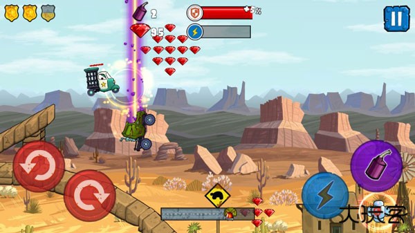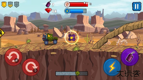 针对于游戏的玩法来说,其实还是比较简单的,左侧主要控制着赛车的重心,右侧以加速和炸弹释放为主,期间关卡中还有许许多多的障碍和路道设计,让每一关都尽显特色。
