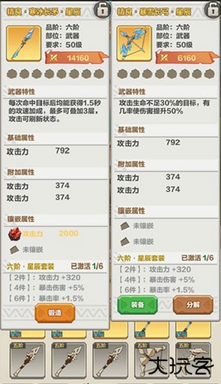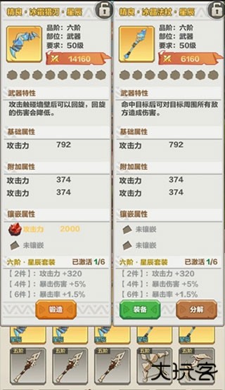 除此外,装备还有套装效果,集齐2、4、6件同套装时,还会有不一样的加成效果。