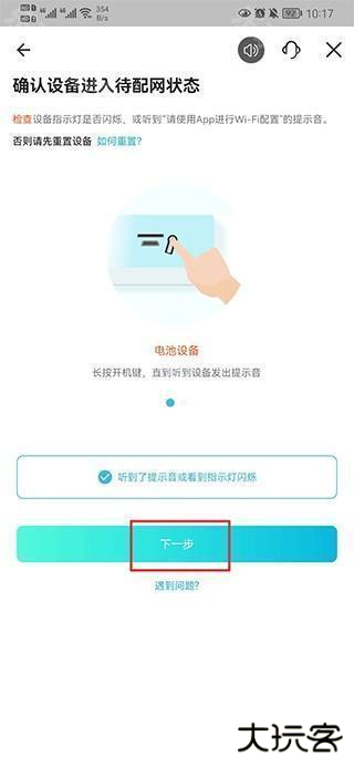 3、按照提示将设备插电开机并在听到提示音后,点击下一步