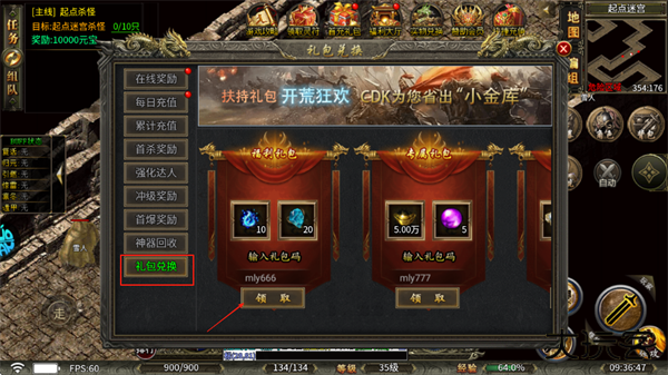 2、弹出页面选择礼包兑换,输入兑换码领取即可