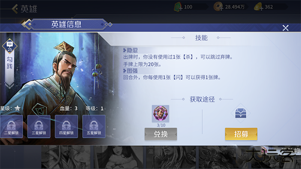提到单挑英雄勾子是一个绕不过去的啊人物。他虽说没有强力的摸牌技能,攻击力也非常一般,但是架不住他能存牌呀。别的英雄一般3~4张就是上限了,但是勾子却能够存20张,每出一张闪还能额外摸一张牌更是加快了他的攒牌步伐。等到时机成熟拿到虎符之后,勾子完全可以成为杀神一挑n。