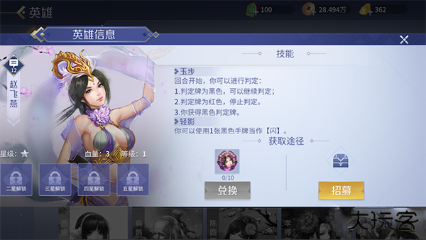 赵飞燕也是单挑非常强力的人物,她在回合开始之前可以进行判定拿到黑色的牌,人品爆发的话无限摸牌没人能顶得住,自身附带的将黑色手牌可以当成闪使用更是大大增强了她的生存能力,只要敌人不能够出两张以上的杀就很难让其掉血,爆发和防御能力都十分不俗。