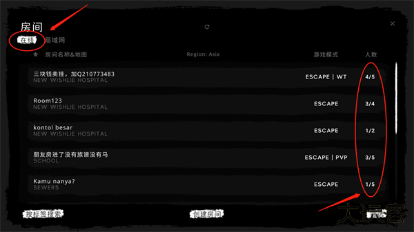 在【房间】中,我们可以看到其他玩家所创建的房间,任意点击一个房间即可与其他游戏玩家共同畅玩。